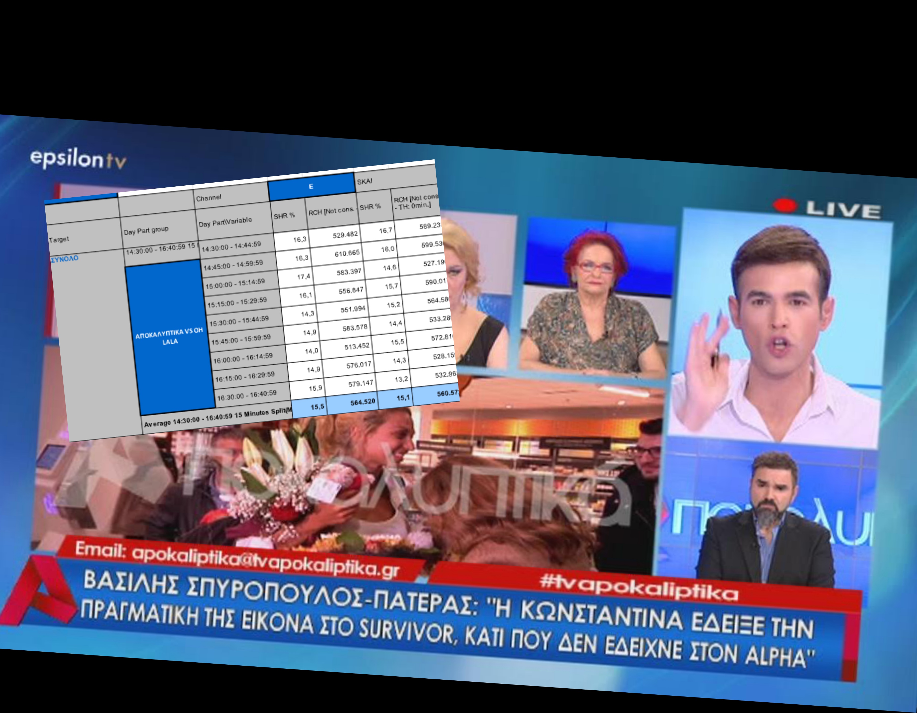 Το ραβασάκι της Νίλσεν έφτασε στο γραφείο μου και για ακόμη μια φορά η εκπομπή που συμμετέχω στο Epsilon TV βρέθηκε στην πρώτη θέση σε συνθήκες παράλληλης μετάδοσης με το αντίστοιχο προϊόν του ΣΚΑΪ.