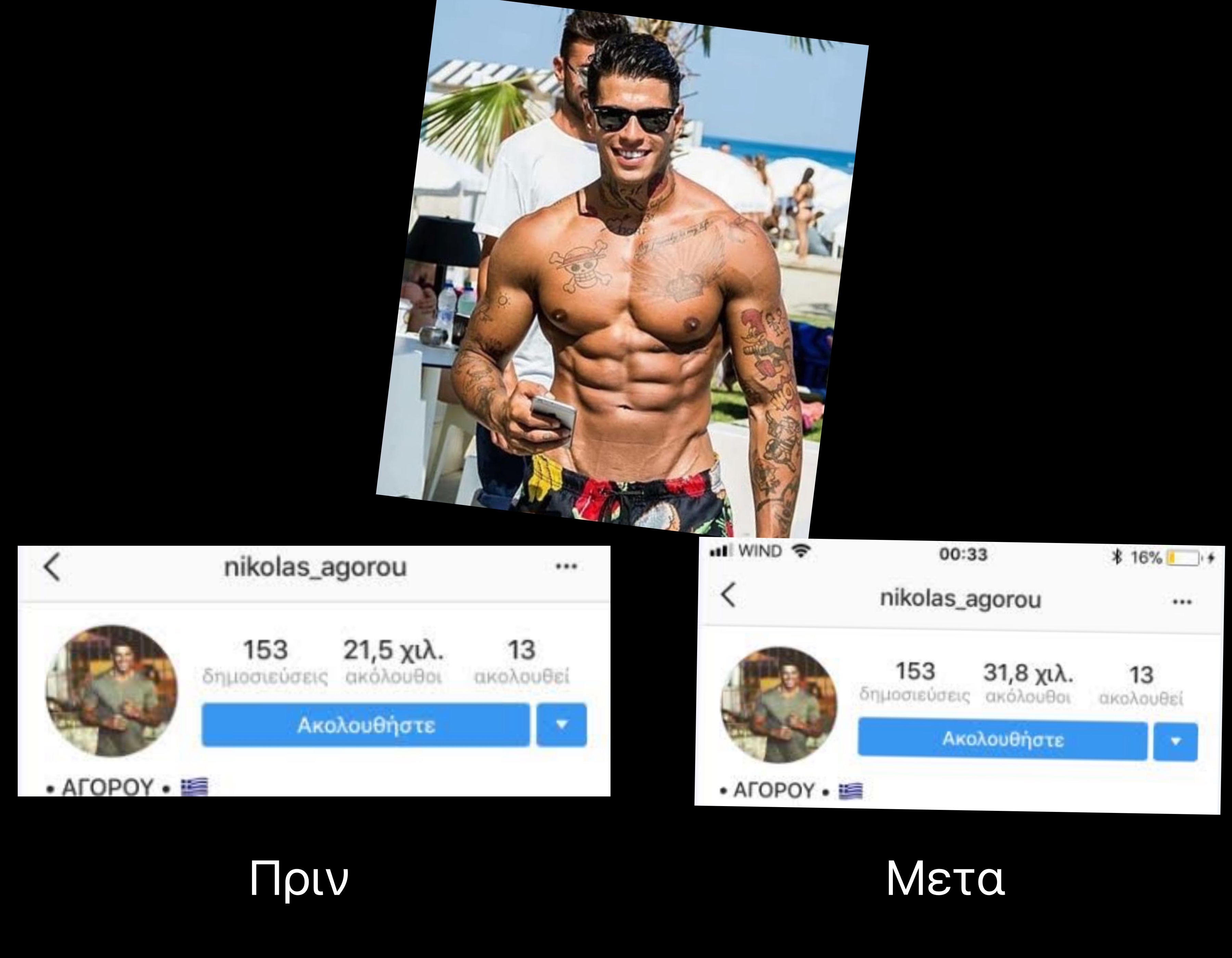 Ο φουσκωτός μοντέλος Νικόλας Αγόρου με τους 20.000 followers και την έπαρση του να ακολουθεί μόλις 13 άτομα στον λογαριασμό του στο instagram είδε στο πρώτο δίωρο προβολής του ριάλιτι τους ακολούθους του να αυξάνονται κατά 10.000 μέσα σ’ ένα δίωρο.
