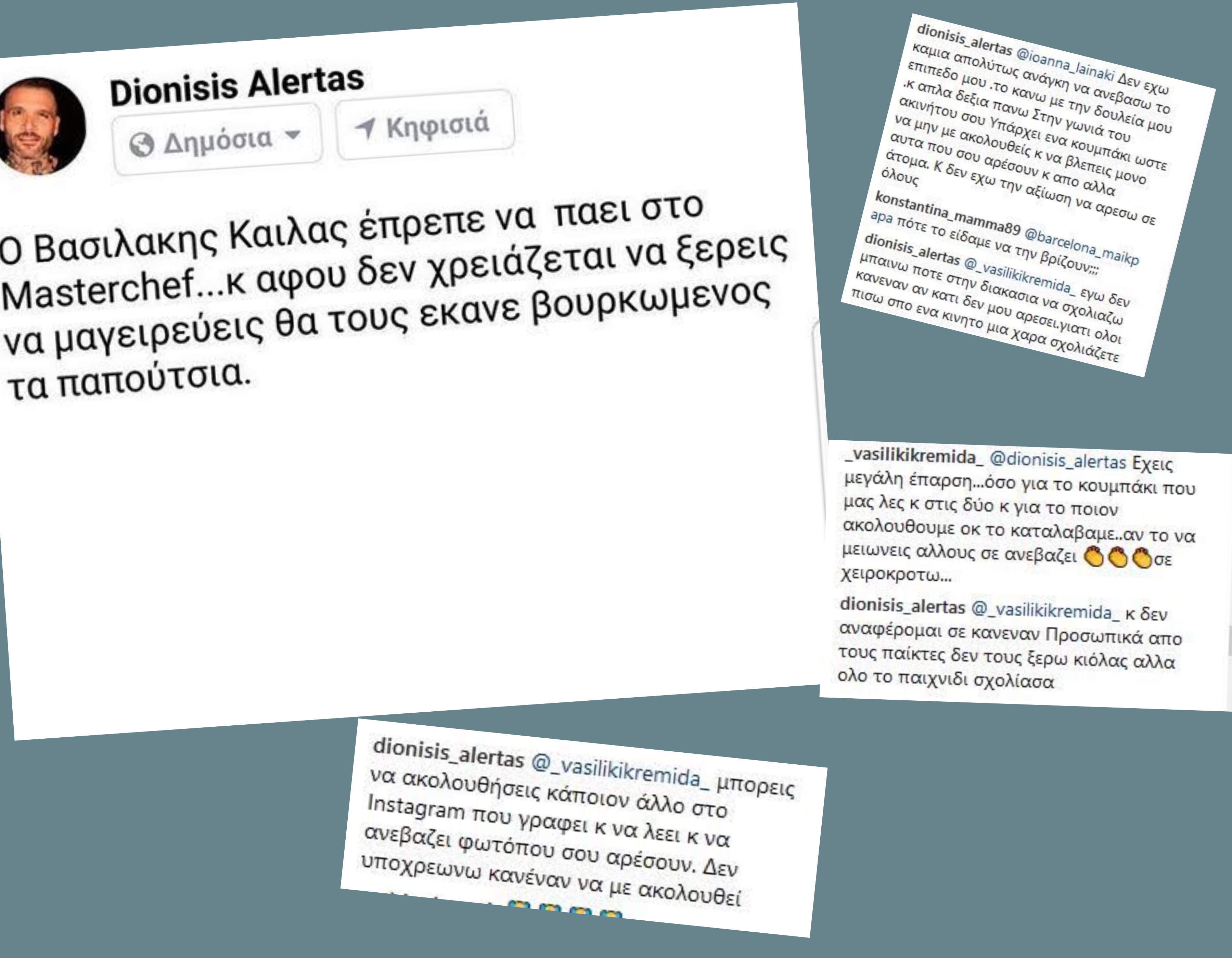 Το σχόλιο του για το Master Chef έκανε ο Διονύσης Αλερτάς δημόσια και δέχτηκε θετικά σχόλια αλλά τα πυρά κάποιων. Μάλιστα, ο ίδιος κάτω από το ποστ σχολιάζει: «Υ.Γ δεν αναφέρομαι σε κανέναν παικτη δεν τους ξέρω κιόλας αλλά σε…