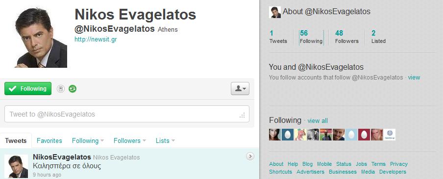 ο Νίκος Ευαγγελάτος έκανε πρωτίστως follow to site του και μετά από 3, 4 άτομα την γυναίκα του Τατιάνα…Ποιός τη είδε την τσαούσα παρουσιάστρια μετά και δεν την φοβήθηκε. Και δείτε…Για του λόγου το αληθές έχουμε και την εικόνα απο το πρώτο του twit…Έτσι Νίκο…Κάνε την επανάσταση σου…αλλά το νού σου…Η σύζυγος δεν ξεχνάει ποτέ…