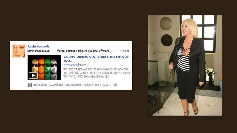 Οικονομικά όσο πληρώνει μέχρι τελευταίου ευρώ την Μενεγάκη-η οποία πέφτει πεφτει πέφτει-έχει πέσει έξω και προσπαθεί τώρα να μαζέψει για μια ακόμη φορά τα αμάζευτα κάνοντας περικοπές σε όλους τους τομείς. Η Ρούλα Κορομηλά αυτή τη στιγμή για τους Γερμανούς συνιστά πονοκέφαλο για το κανάλι, αφού δεν κάνει κάτι συγκεκριμένο και πληρώνεται. Κι όταν λέμε δεν κάνει κάτι συγκεκριμένο εννοούμε πως έχει δρομολογήσει πια τις δύο εκπομπές που είναι υπέυθυνη, το «Δέστε τους» και το «Μες την καλή χαρά» και περιμένει μήπως γίνει το «Greek Idol». Βεβαίως όλα αυτά μπορούν ν΄αλλάξουν άν αλλάξει το ιδιοκτησιακό καθεστώς του μαγαζιού. Και κρατήστε αυτό που σας γράφω σήμερα…Δεν είναι τυχαίο επίσης, πώς πολλές φορές, η Ρούλα δείχνει τη στεναχώρια της μέσα από το Facebook, όπως πριν 2 μέρες που έγραψε «kalhmeraaaaaaaa!!!!!!! feygei o xronos grhgora ola einai efhmera………!!!!!!!!!! και έβαλε το συγκεκριμένο τραγούδι….