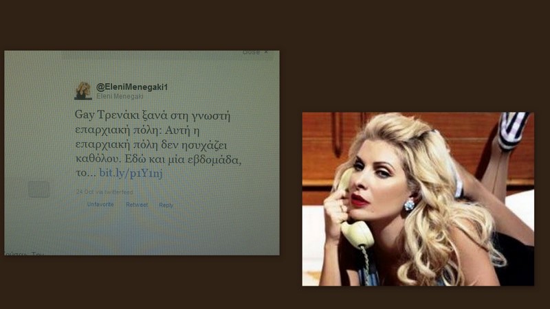Λίγο τα νούμερα τηλεθέασης-που πέφτουν μέρα με την μέρα-,λίγο η αλλαγή ώρας φαίνεται ότι έχουν αλλάξει την Ελένη Μενεγάκη. Την έχουν κάνει κατάτι κίτρινη. Πώς αλλιώς μπορεί κανείς να εξηγήσει αυτό που μόλις προχθές ανέβασε στο twitter της…Πώς μπορεί κανείς να εξηγήσει την απόφαση της…κατα τα άλλα διακριτικής παρουσιάστριας να ασχοληθεί με μια ομαδική συνεύρεση gay σε πόλης της περιφέρειας;…Λέτε να το δούμε και σε θέμα στην εκπομπή της; Πολύ πιθανόν σε λίγο καιρό όταν οι θεαματικότητες θα μοιάζουν πολικές…Το σίγουρο είναι πώς η ίδια δεν ανεβάζει τα θέμματα κι αυτό φαίνεται απο το μπάχαλο των επιλογών της…ή μήπως ακριβώς γι αυτό τον λόγο αποδεικνύεται ότι είναι η ίδια, αλλά έχει μάθει κομματάκι στραβά-γιατί άραγε- τα μυστικά των social networks; Διαβάστε και δείτε με προσοχή τι πόσταρε η ξανθιά παρουσιάστρια προχθές…αν είναι η ίδια βεβαίως πίσω απο τον λογαριασμό και δεν είναι fake…