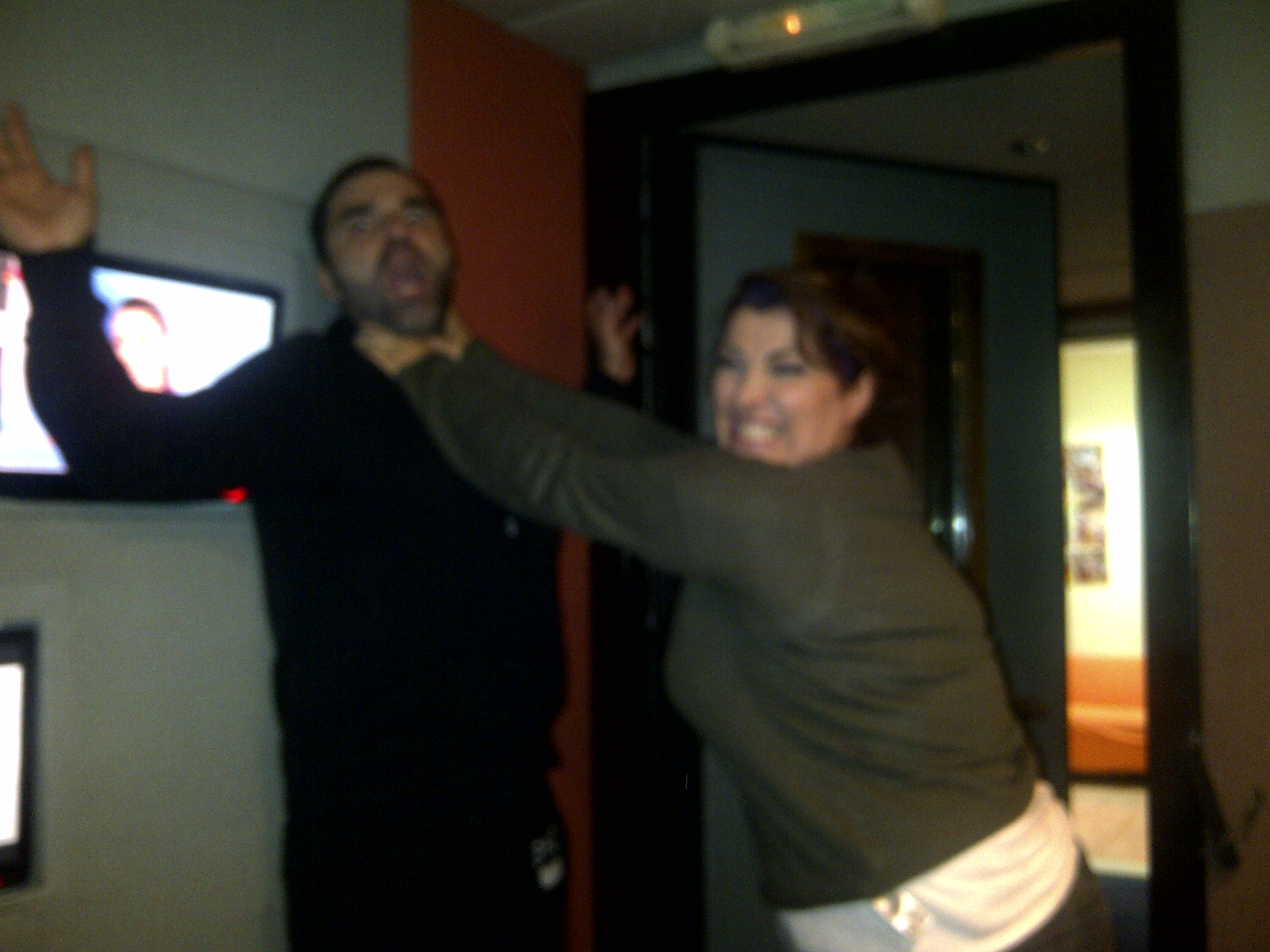 Η Κατερίνα σηκώνεται απο την καρέκλα με αρπάζει απο τον λαιμό με κολλάει στον τοίχο-είναι δυνατό ελέω βαρύτητας και λίγω κιλών παραπάνω-και μου λέει «Θα ξαναγράψεις κάτι κακό για μένα ρε;». Στην αρχή εξεπλάγην. Όταν μάλιστα είδα και τον Παπαδάκη να σηκώνει την φωτογραφική και να φωτογραφίζει…λέω μέσα μου «Αυτοί οι δύο είναι συννενοημένοι». Αποφεύγω την Κατερίνα με τρόπο…αθλητικό, και με μια γρήγορη κίνηση παίρνω απο τα χέρια του Νίκου την φωτογραφική μηχανή. Ορίστε λοιπόν τα πειστήρια. Δείτε πώς μου επιτέθηκε η Ζαρίφη…Κι εγώ επιφυλάσσομαι παντός νομίμου δικαιώματός μου…Θα σε στείλω στο εδώλιο κυρία μου για επίθεση με ενδεχόμενο δόλο. Ξεδιάντροπη κυρά…Άσε που έχω και τις φωτογραφίες σου απο την μηχανή…που είναιιιιι…λουκούμι!