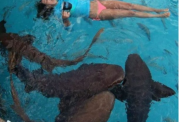 Δεν φοβάται. Άλλωστε η θάλασσα είναι το στοιχείο της. Αλλά να κολυμπά μαζί με…καρχαρίες; Ε… αυτό δεν το βλέπεις συχνά. Και να ποζάρει μάλιστα ανενόχλητη;