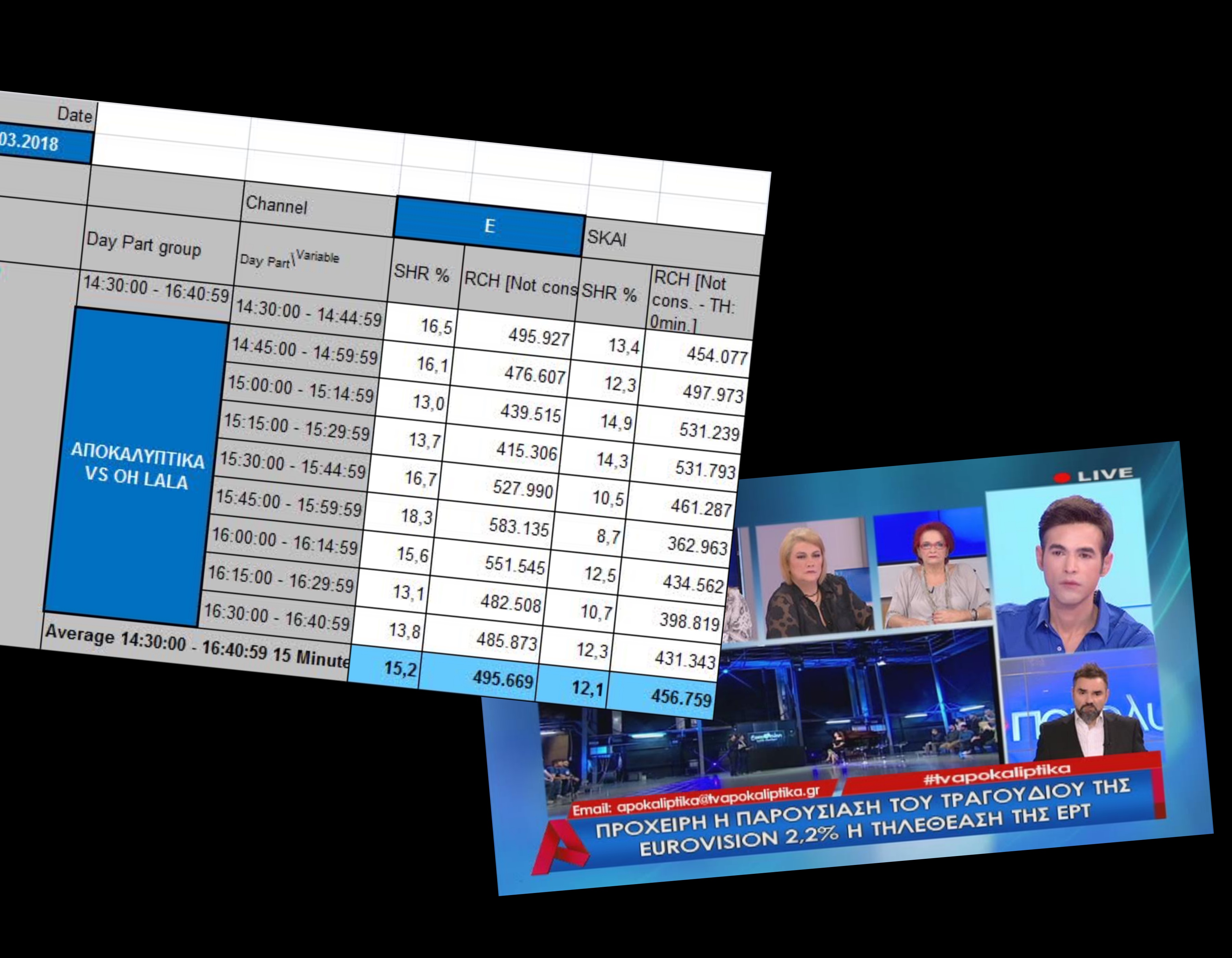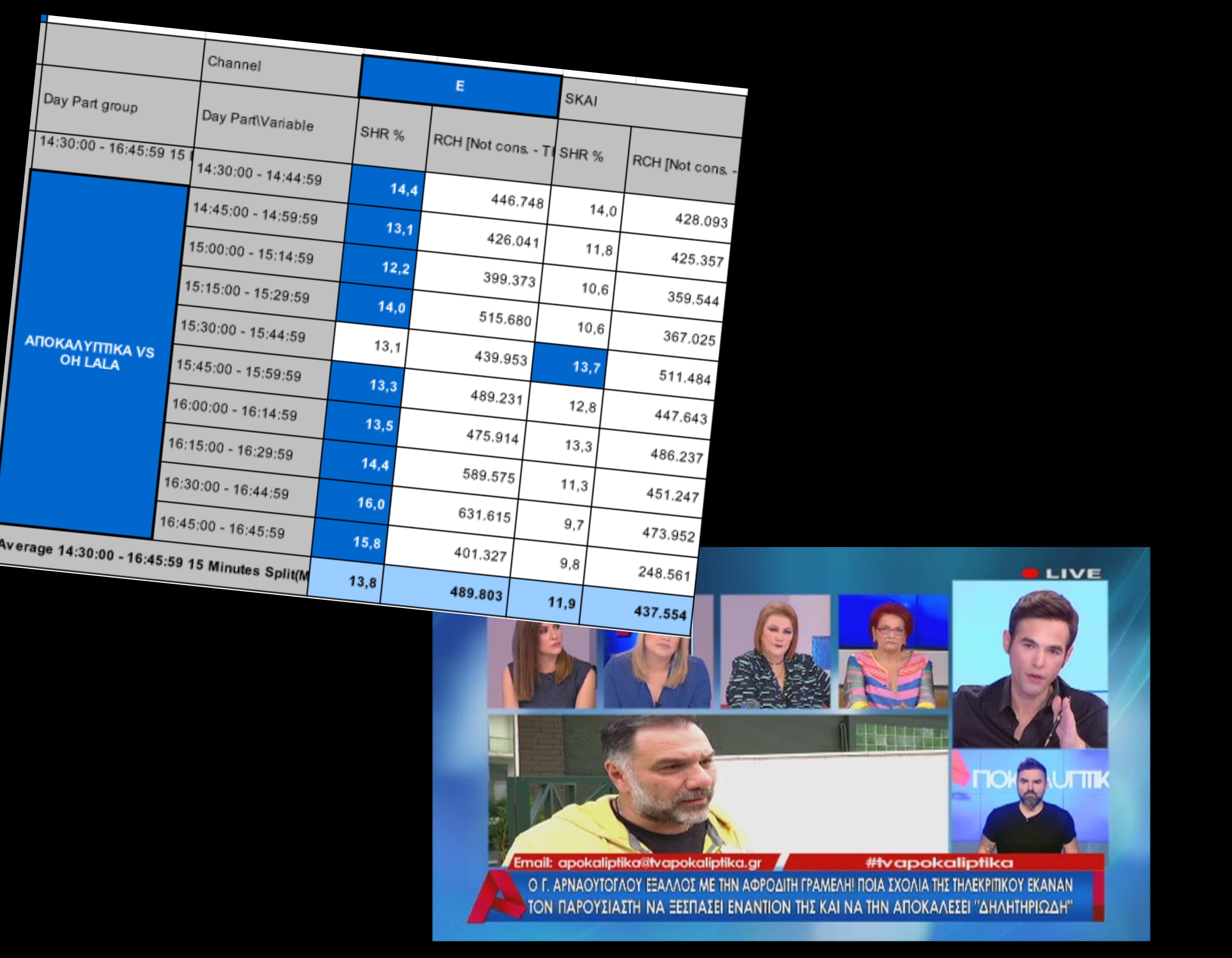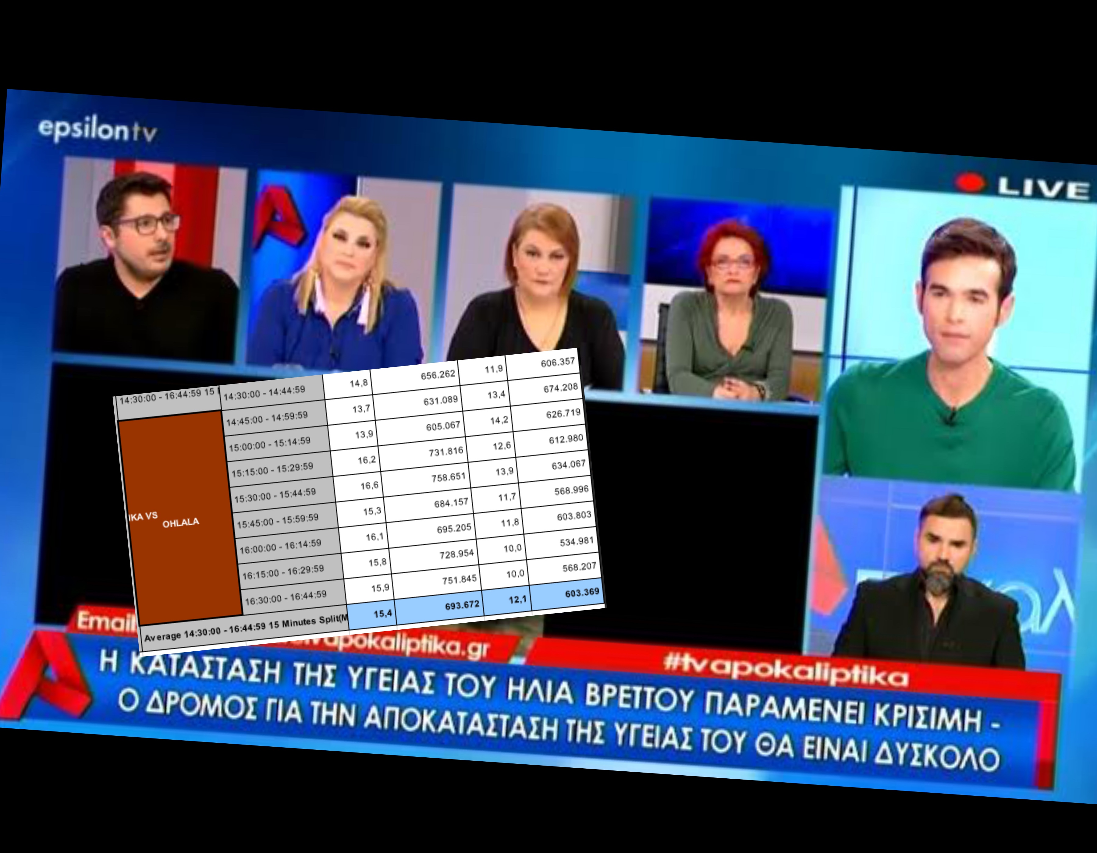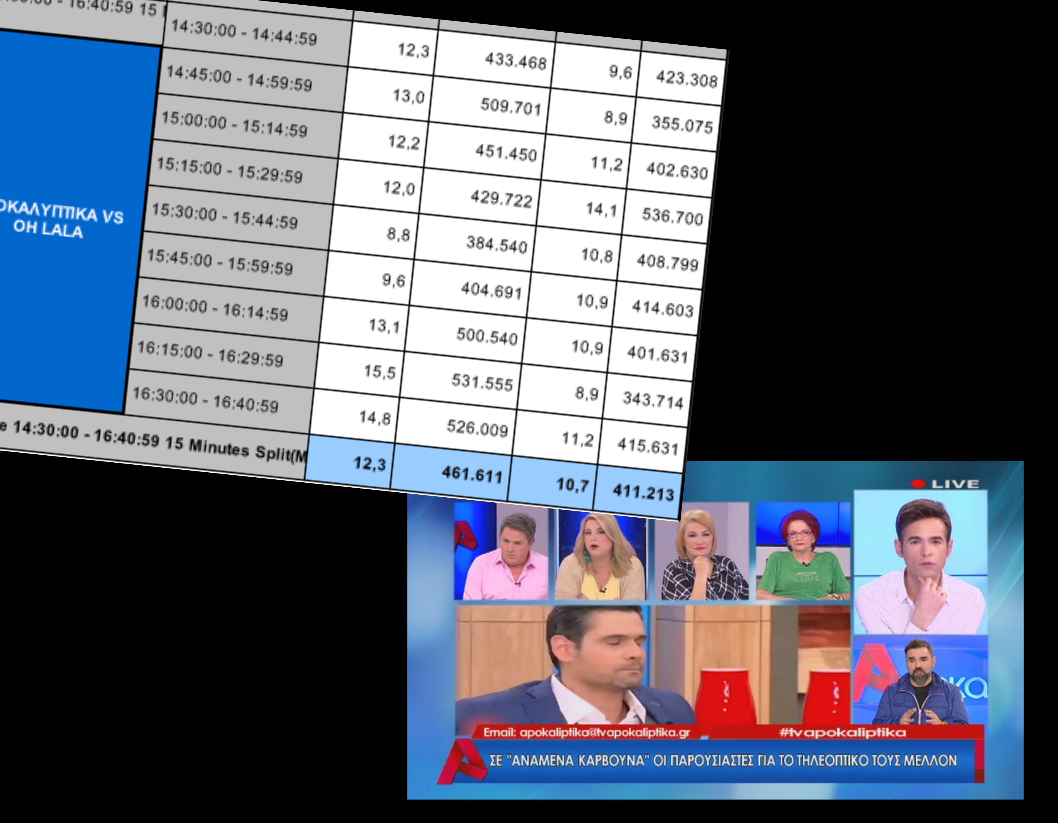 Φαίνεται πως παρά την “τρύπα” που προκάλεσε η διακοπή του προγράμματος εξαιτίας του απειλητικού τηλεφωνήματος για βόμβα στο στούντιο, η εκπομπή “Αποκαλυπτικά” παρέμεινε ψηλά στην τηλέθέαση σε σχέση πάντα με τον ανταγωνισμό.
